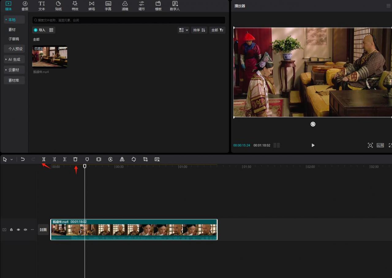 之中我们打开剪映,把视频导入进去截取要使用的片段。