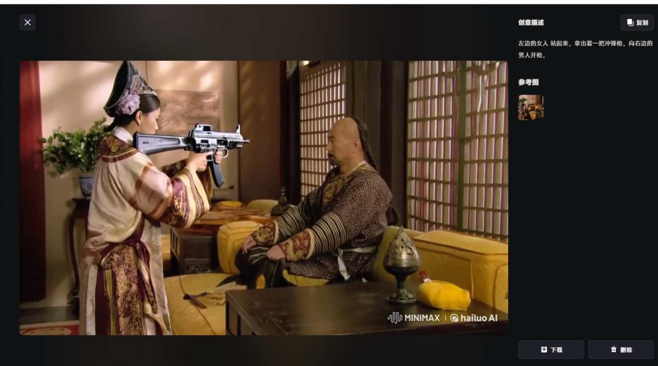 选择图生视频,把图片上传,并输入描述词:左边的女人 站起来,拿出着一把冲锋枪,向右边的男人开枪,模型不变直接生成。